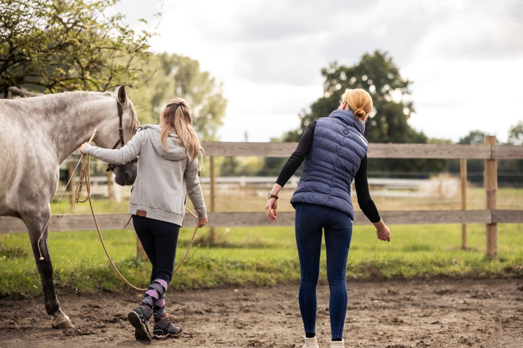 Neben ganz viel verdaulich aufbereitetet Theorie zu Anatomie, Biomechanik und Trainingslehre und Übungen ohne Pferd trainieren wir individuell im Einzelunterricht.